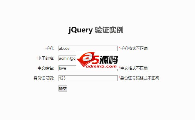 jQuery表单验证实例演示代码是一款可以设置手机号码,电子邮箱,中文姓名,身份证号码等表单验证代码。