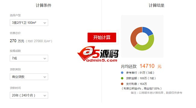 jQuery房贷计算器代码是一款选择户型、估算总价、按揭成数、贷款类别、贷款时间、计算结果、月均还款等统计图表显示代码。