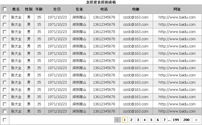 1.代码干净,无冗余标签. 2.样式,结构分离(为了方便,样式用内联的形式,实现应用时可以用外联方式引用.) 3.用JS控制表格的逐行变色 4.支持选中项高亮 5.支持checkbox的全选/取消功能 6.分页标签已经做好,没有做后台代码(以后有时间更新) 7.兼容性测试:已测试过ie5.01 ie5.5 ie6 ie7 ff2 opera浏览器