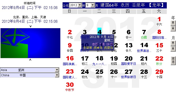 两百年国历与农历程式 (IE版),包括日历、世界时间、农历、阳历、阴历、节日、时区、节气、干支、生肖等,功能非常全,推荐!