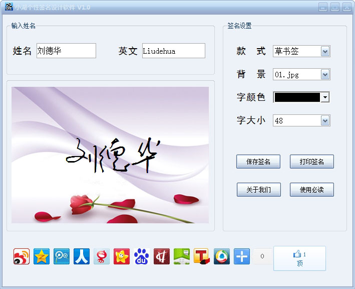 只需几步轻松设计你的个性签名,软件提供多种样式选择。不但可以更换你喜欢的背景、字体颜色、字体大小,还可以把你的个性签名打印出来!