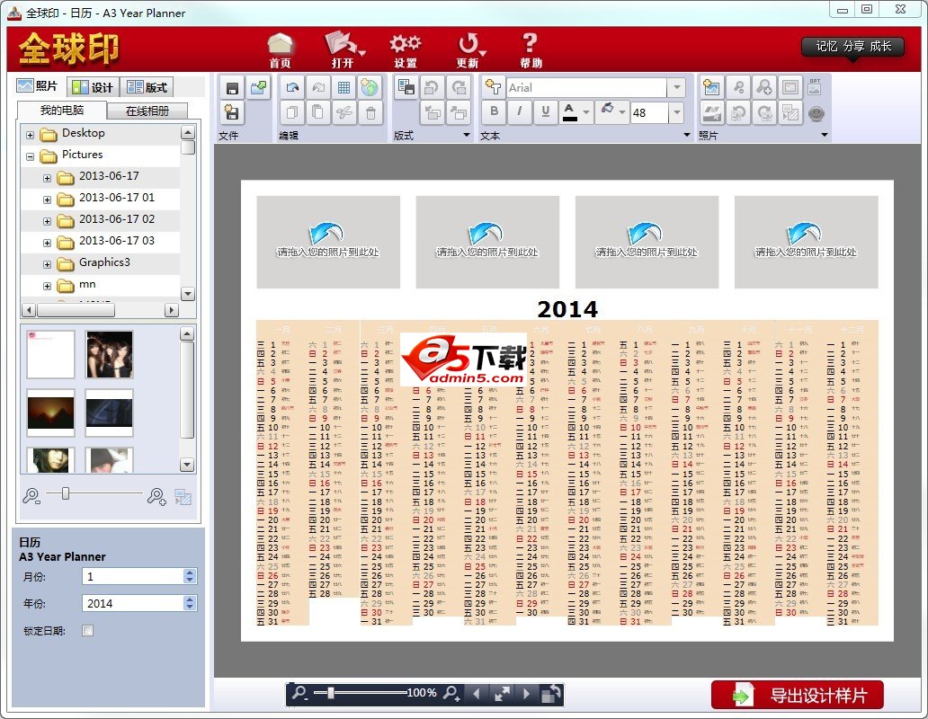 打开软件,进入挂历及台历分类,各个分类下面有各自对应的产品。打开产品进入产品编辑界面,您可以拖动照片到编辑区,可以对照片进行放大缩小、旋转、设为背景等功能。挂历和台历提供的日期是万年历,可以随意设置起始年月。在软件的左下角可以设置,也可以双击日历区域,弹出设置对话框,对其进行设置。对日历中的背景、文字大小、字体、日历的起始日期等都可以很方便的设置,这方便客户,更方便生产者,不用再设计模板和日期。