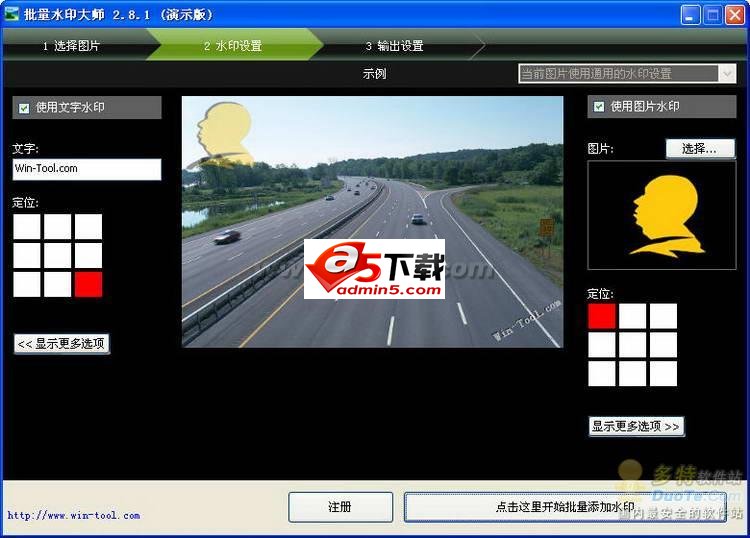 第二步:水印设置 - 设置水印效果,实时预览,所见即所得。