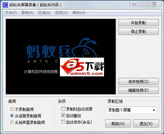 蚂蚁兵屏幕录像(原桌面录像精灵)是一款简洁易用的屏幕录像软件,能够让您得心应手地将您的屏幕显示、话筒输入、扬声器音频等记录为AVI视频文件。提供录制整个屏幕、录制选择区域、录制固定区域等多种录制方式,在录制时可包括视频、音频、实际光标和自定义光标,并可设置为录制区域随光标动态移动;软件具有丰富的音视频参数设置功能,可自定义操作热键等。界面简洁大方、操作极为方便,是一款绿色软件。