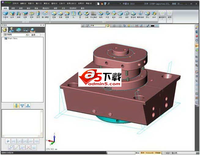 混合建模工具为仅用简单步骤建立拔模,分模,模具型芯型腔制作提供了可能,模具模型建立更容易。模具功能中还提供一些主要的模具设计模块,如滑块、抽芯、顶针和冷却水道等。零件库功能提供一些主流厂商的模架零件,方便用户快速建立整个模具系统。